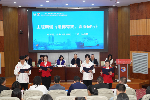 随后,由韩彭蕾、钱力(柬埔寨)、孙雅琴、沈韬四位“小叶子”代表带来的主题朗诵《进博有我,青春同行》,以铿锵有力的语调,抒发了海大青年对进博的向往、对责任的担当以及对未来的承诺,展现了“志在愿在我在”的豪情壮志。
