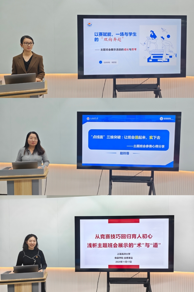 本期训练营特别邀请学校三位在上海高校辅导员主题班会展示活动获奖辅导员代表担任主讲嘉宾。食品学院辅导员金素莱曼以《从竞赛技巧回归育人初心:浅析主题班会展示的“术”与“道”》为题,剖析了如何在竞赛中平衡形式创新与教育本质,强调“班会的生命力在于对学生成长需求的精准回应”;赵玲蓉通过《“点线面”三维突破:让班会活起来,实下去》,系统阐释了以“关键问题为点、成长脉络为线、协同育人为面”的设计逻辑,提出“用结构化思维激活班会的思想深度”;陈蔚荻则以《以赛赋能,一场与学生的双向奔赴》为分享主题,讲述了通过班会与学生建立情感联结、共同成长的实践故事,传递出“班会是师生共同的精神场域”的深刻认知。三位老师从所带班级学生学情入手,从不同维度分享了主题班会的主题选择、设计理念与实践心得。分享既有理论高度,又有实践温度,为在场辅导员打开了从设计班会到读懂学生的思维窗口,引发了关于让班会更贴近学生、更有教育实效的深度思考。